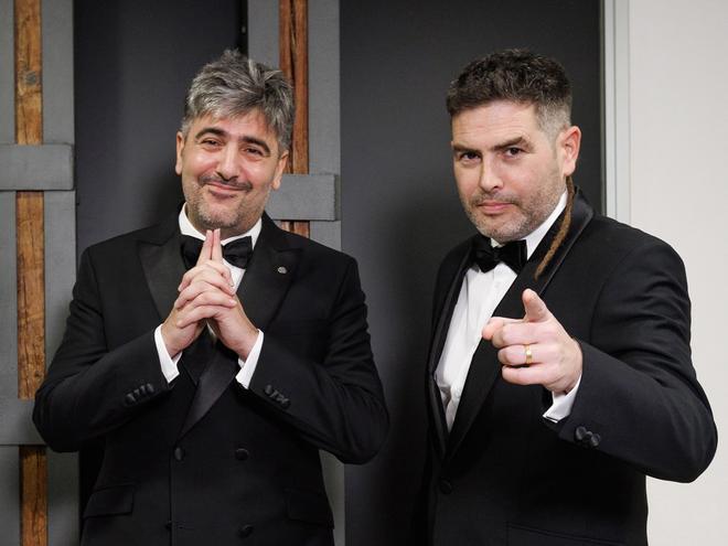 Estopa lució esmóquines de alta sastrería. David Muñoz llevó un esmoquin de doble botonadura con solapas en punta de lanza, mientras que José Muñoz optó por un esmoquin de un solo botón con solapas redondeadas, ambos en lana fría negra y seda natural.